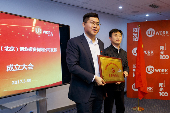 北京市朝阳区非公经济工作委员会党委副书记马序松为中共优客工场(北京)创业投资有限公司支部颁牌