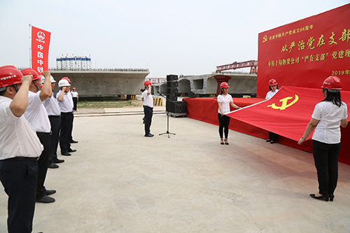中铁十局物贸公司“严在支部”党建现场会在鲁南高铁菏泽制梁场召开。图为公司员工在重温入党誓词。