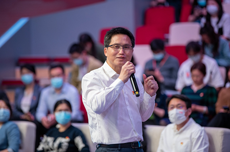 展示环节中,参评选手还邀请自己支部的党员同志,部门的同事小伙伴以及神秘嘉宾,诙谐幽默地为他们助阵加油,展现了昂扬热烈团结奋斗的企业文化。在评委提问环节,面对人民网管理层领导和特邀嘉宾评委的“高难度”问题,他们同样能够从容应对,展现真我,博得了评委和观众的阵阵掌声。