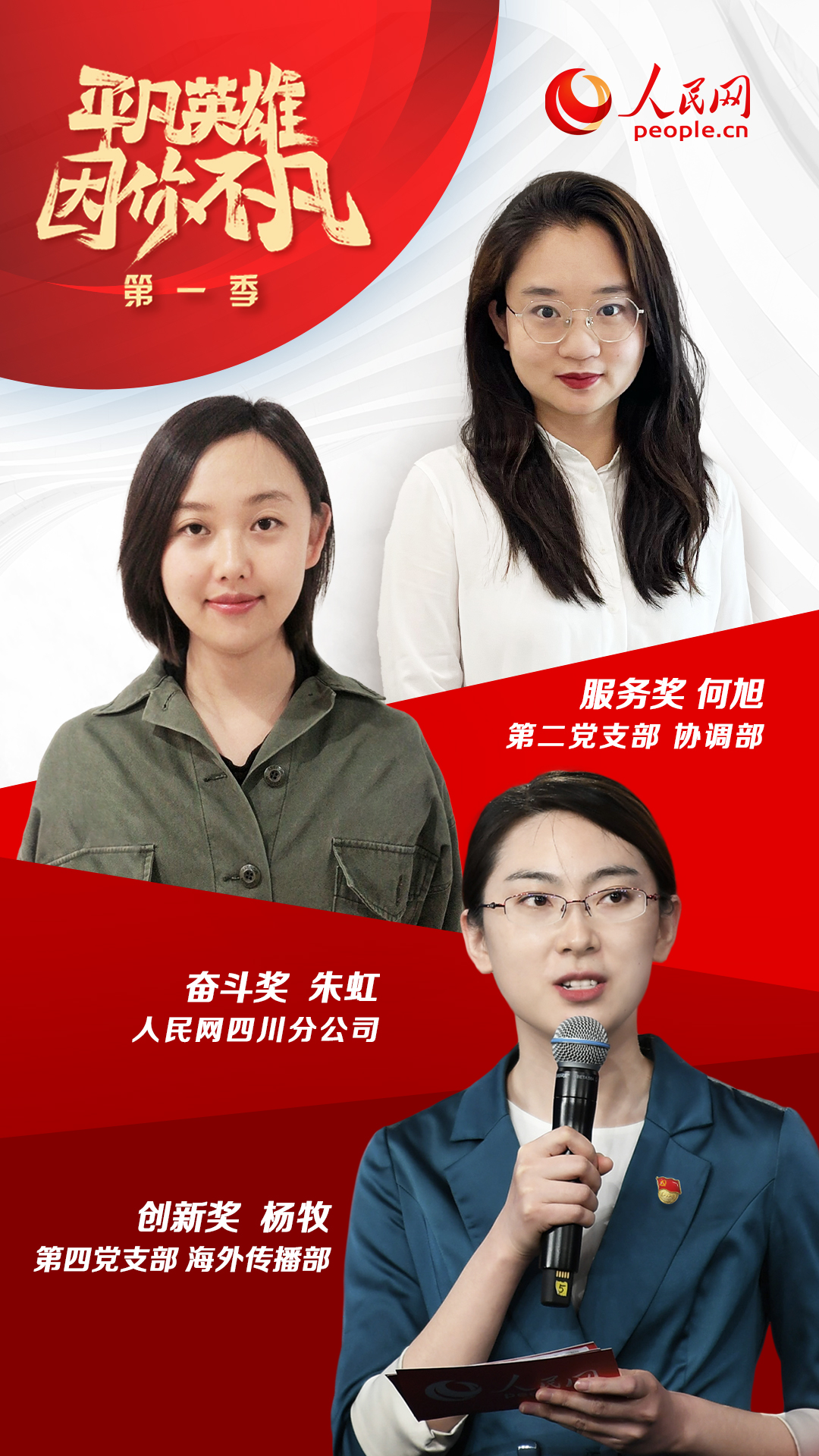 经过激烈比拼,第二党支部何旭(协调部)、第四党支部杨牧(海外传播部)、四川分公司朱虹三位同志最终分获“平凡英雄”服务奖、创新奖和奋斗奖。同时,第七党支部董晓伟(网络评论部)、第十一党支部厉姣(纪检监察室)、第十三党支部郑潇潇(移动内容部)、第二十一党支部张利娟(人民视听科技有限公司)、安徽分公司李希、山西分公司马莹等六位同志获得“平凡英雄”入围奖。