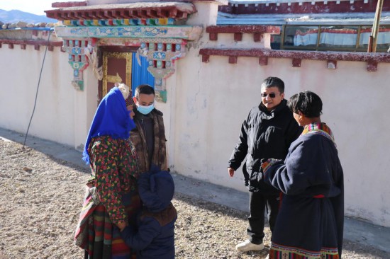 王军强(右二)在申扎县巴扎乡结对帮扶户达吉家中了解生活情况。(图片由申扎县委宣传部提供)