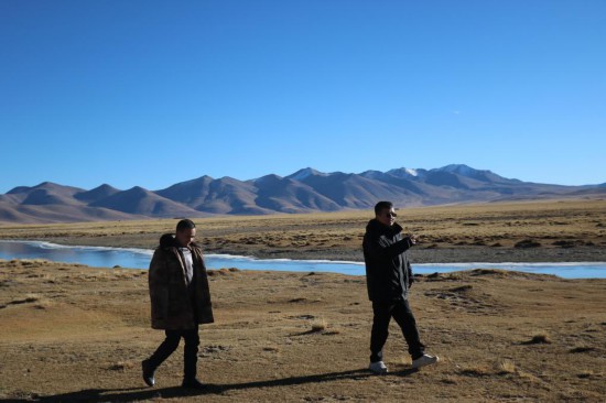 王军强(右)在申扎县巴扎乡查藏藏布巡河。(图片由申扎县委宣传部提供)