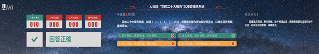 参观过程中,人民网“党的二十大精神”沉浸式学习平台成为了关注的热点。该平台涵盖“党的二十大报告”知识图谱、“党的二十大精神”沉浸式答题系统、“党的二十大报告”虚拟展馆等。其中“党的二十大精神”沉浸式答题系统包括“党的二十大报告”相关的权威题库,结合知识图谱内容和智能抢答、记分设备,为基层党组织提供了从集体学习到集中测验、从沉浸式学习到互动式竞赛的创新解决方案。