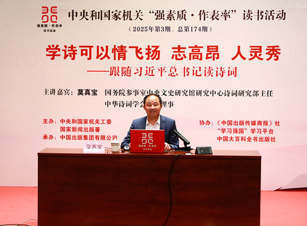在第30个“世界读书日”到来之际,为落实习近平总书记在致首届全民阅读大会的贺信中提出的“广大党员、干部带头读书学习,修身养志,增长才干”重要要求,4月25日,中央和国家机关“强素质·作表率”读书活动举办2025年第3期主题讲座。国务院参事室中央文史研究馆研究中心诗词研究部主任、中华诗词学会常务理事莫真宝以《学诗可以情飞扬 志高昂 人灵秀——跟随习近平总书记读诗词》为题作讲座。中央和国家机关各部门党员干部300余人参加。