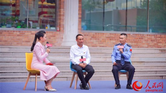7月28日,何春明(右一)在“牢记嘱托 感恩奋进——2025行走的思政课”系列主题活动乌鲁木齐市天山区固原巷社区专场活动中,分享下马崖边境派出所戍边为民的故事。人民网 李欣洋摄